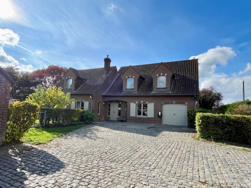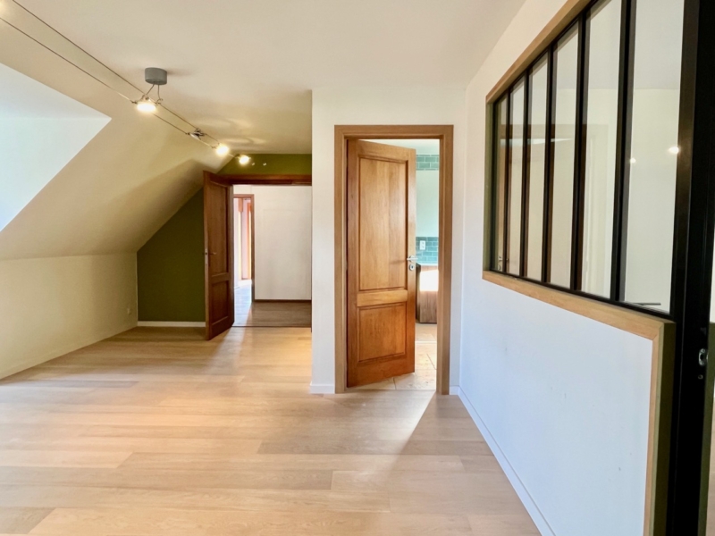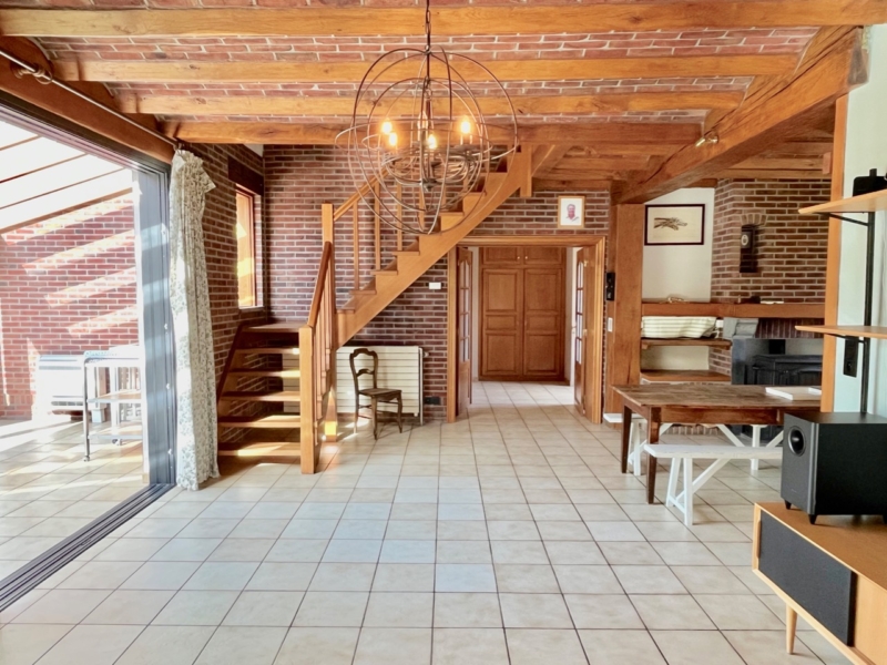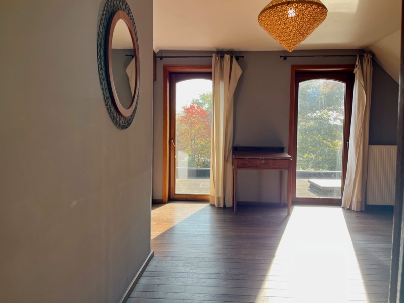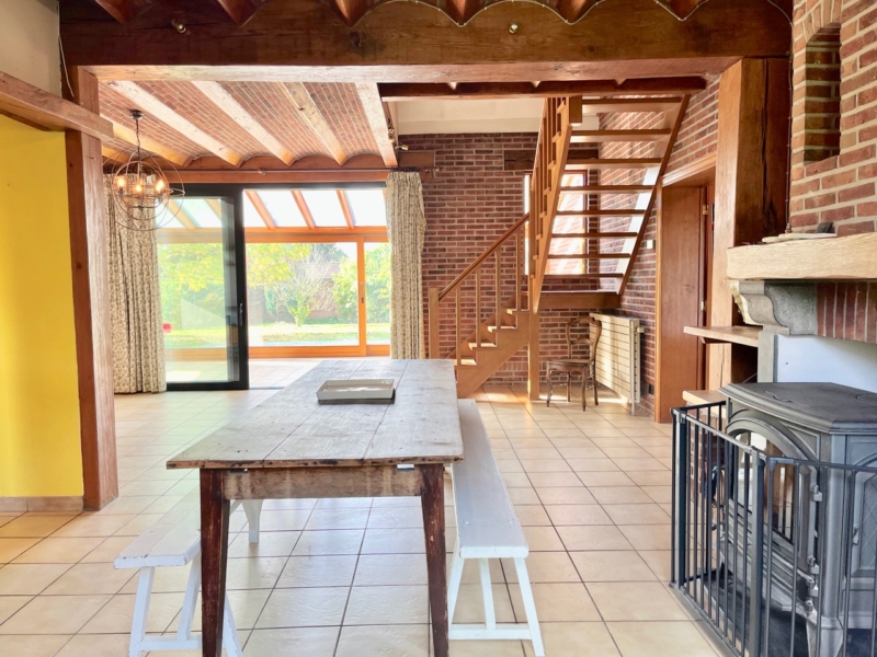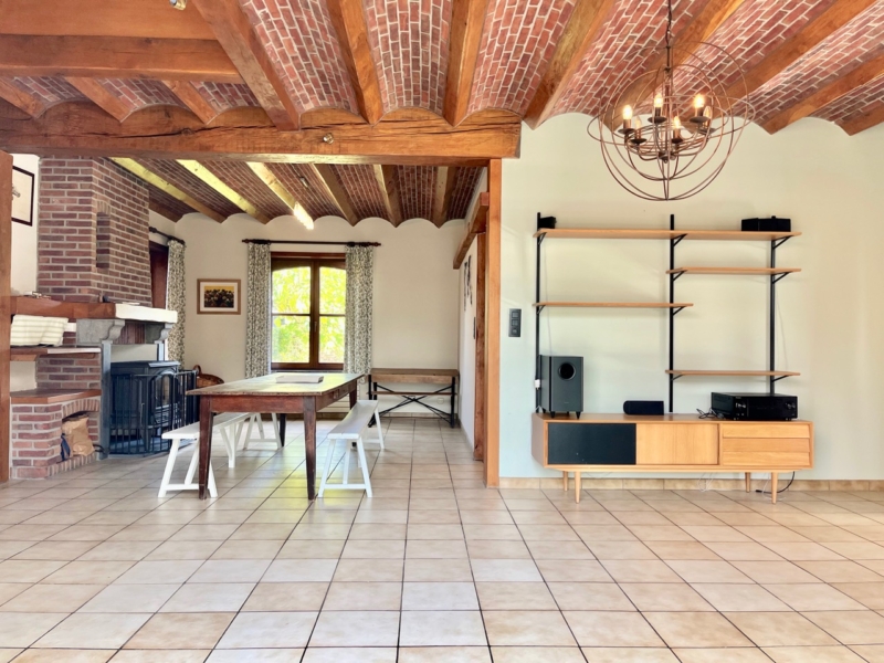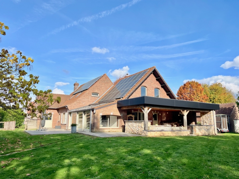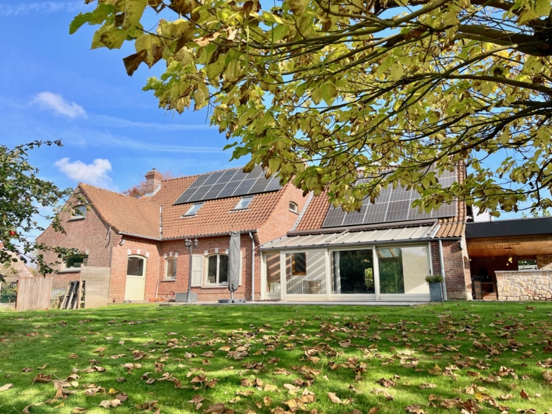 Coup de coeur assuré ! Cette villa au caractère enchantant offre des espaces et volumes idéaux. Elle semble déposée au calme sur un terrain de plus de 30 ares (sur deux parcelles en zone d’habitat), parfaitement orientée Sud avec des champs en arrière zone. Des dépendances : grand garage indépendant (65 m2) et abri de jardin viennent compléter l’ensemble. La propriété, idéale pour une grande famille et/ou pour une profession libérale, se découvre via un vaste espace de stationnement intérieur en pierre porphyre. On découvre alors l’élégant bâtiment associant le bois, la brique, la pierre,… Les pièces de vie se déclinent comme suit : un vaste hall, un spacieux salon – salle à manger, une cuisine, une véranda le tout prenant jour sur le jardin arboré, 2 chambres/bureaux au rez, une salle de bain, un grand garage, un cellier, une pièce dans la prolongation du garage en complément. À l’étage : un palier dessert d’un côté une chambre parentale avec dressing, une salle de douche italienne avec wc et lavabo, et de l’autre côté un vaste palier dessert 3 belles chambres et une salle de bain (douche italienne, baignoire, wc, lavabos). Plusieurs terrasses offrent une vue bucolique, dont une sous pergola récente. L’élégance et la qualité de la construction/rénovation, mettant en lumière la beauté des matériaux, offre au premier regard dans ce lieu de vie un sentiment de confort paisible. PEB B 373m2 SEM, panneaux photovoltaïques, citerne d’eau, AirCo chaud-froid,… Prix indicatif : 540.000€ – Prix, publication, superficies à titre indicatif, non contractuels –