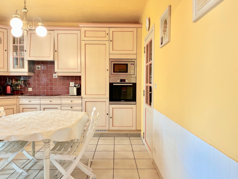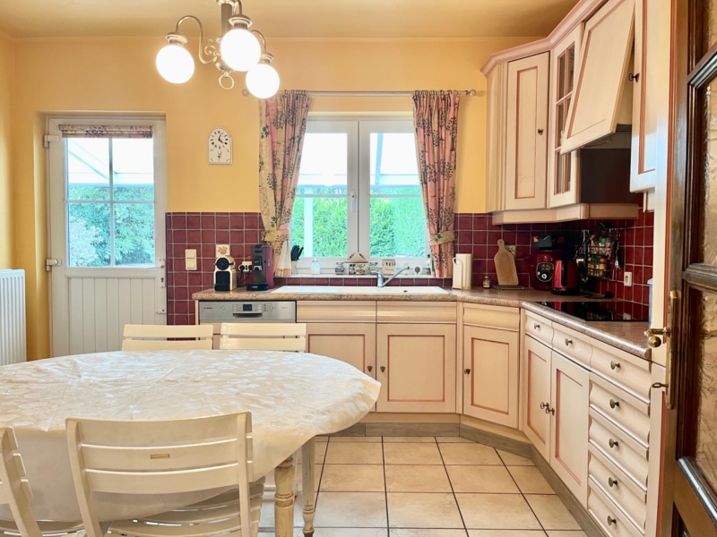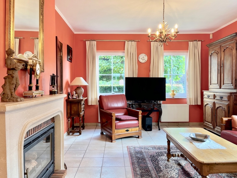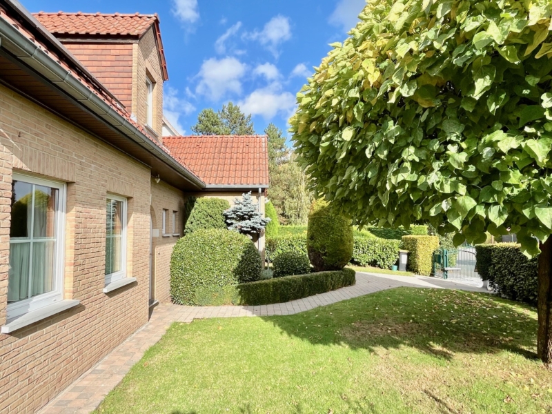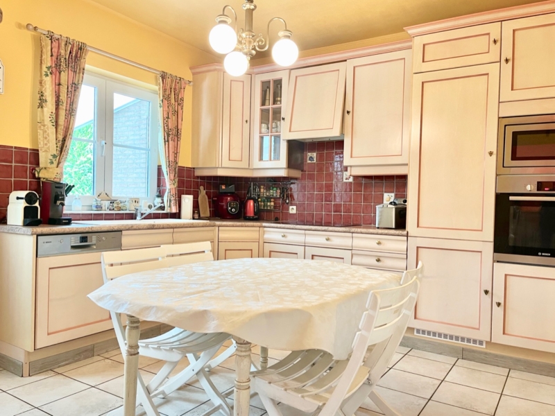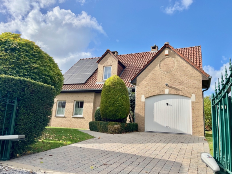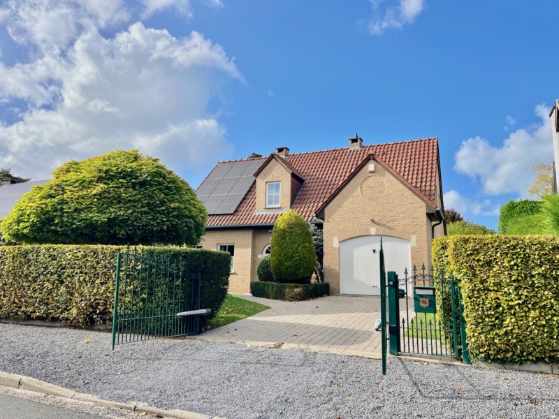 Cette villa construite avec attention offre de beaux espaces parfaitement distribués. Vous serez accueillis par un hall d’entrée desservant un espace de vie : salon – salle à manger lumineux (avec feu ouvert), une cuisine prenant jour sur le jardin, un wc séparé, un hall, un grand garage 2 voitures, buanderie. À l’étage : un hall de nuit dessert 1 salle de bain et 4 chambres dont une suite parentale avec salle de douche privative, un wc séparé, une salle de douche. Nouvelle chaudière au gaz, nouveau chauffe-eau avec panneaux photovoltaïques. PEB C. Jardin arboré et clôturé avec portail et emplacements de parking.